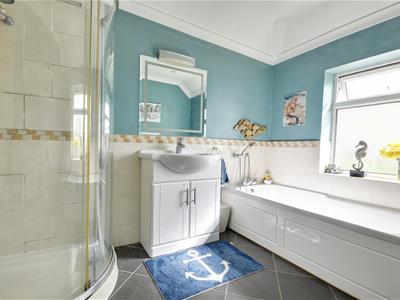 3.016 x 2.388 (9'10" x 7'10")Tiled floor, toilet, basin, bath, shower cubicle, radiator, heated towel rail, window to rear with views
