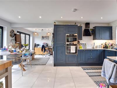 The Kitchen area is extensively fitted with a range of blue shaker style cupboard and drawer base units with matching wall mounted cupboards, complementing quartz stone work surface with tiled splash-backs and inset 1.5 bowl stainless steel sink unit, inset AEG electric hob with extractor canopy above, upright unit housing integrated AEG double oven, integrated fridge/freezer, integrated dishwasher, integrated washing machine and recessed ceiling spot lights.