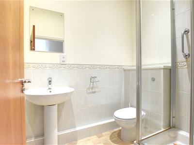 Walk in shower cubicle with chrome controls and chrome showerhead, folding door, wc with concealed cistern, pedestal mounted wash hand basin, electric shaver point, chrome heated towel rail, half height wall tiling.