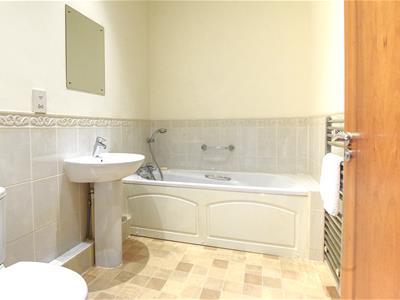 Suite comprising panelled bath with hand/shower attachment, wall mounted chrome heated towel rail, wc with low level flush, pedestal mounted wash hand basin, half height wall tiling, hand shower attachment, electric shaver point.