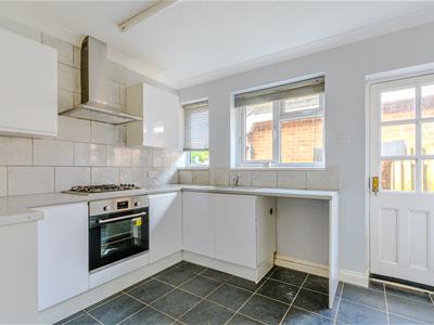 2.74m x 3.33m (9' x 10'11)Double glazed windows to side, range of matching high gloss wall and base units with work surfaces over, sink unit with side drainer with mixer tap, integral electric oven, four ring gas hob (supplied by a Calor gas bottle) with stainless steel extractor set above, space for fridge/freezer, space and plumbing for washing machine, open shelving, tiled floor, wooden and glazed door to side.