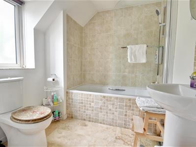 2.35 x 2.08 (7'8" x 6'9")Window to rear. A white suite comprising bath with shower / screen over, wash basin and wc.