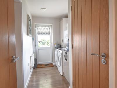 With internal door leading to double garage, fitted cabinets with fitted marble effect worktop surfaces, space and plumbing for washing machine and tumble dryer, gas central heating and domestic hot water boiler, double glazed window overlooking the rear elevation, double glazed glass panelled door giving access onto the rear garden.