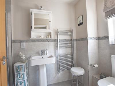 WC with low level flush, wash hand basin with mixer tap, walk in shower cubicle with chrome wall mounted shower controls, shower attachment and showerhead, part tiled walls, tiled flooring, heated chrome towel rail, obscured double glazed window to the side elevation.