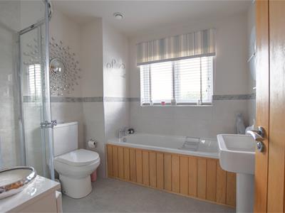 Modern suite comprising wc with low level flush, wash hand basin with mixer tap, panelled bath with mixer tap, walk in shower cubicle with chrome wall mounted shower controls, chrome shower attachment and chrome showerhead, part tiled walls, tiled floor, chrome heated towel rail.