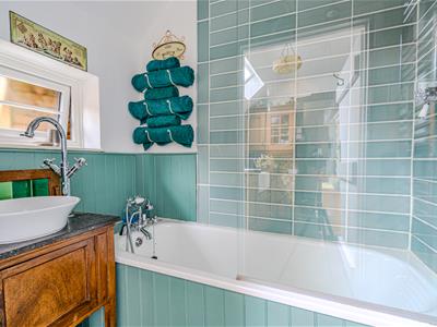 Frosted window to rear aspect, bath with shower attachment, painted wood panelled walls, tiled surround round bath and shower, circular wash hand basin with mixer tap, heated towel rail, fitted corner medicine cabinet.