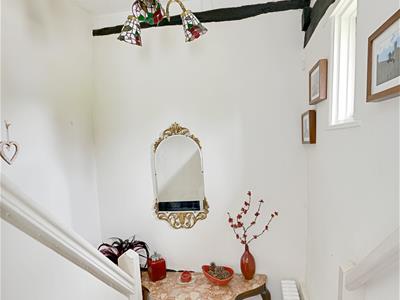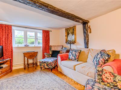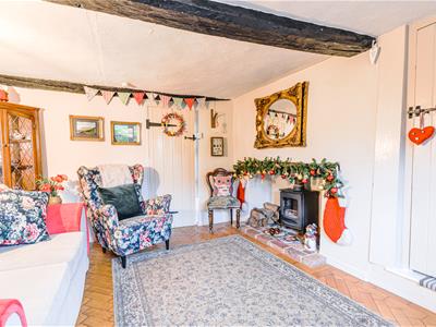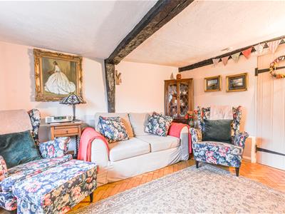 3.86m x 3.20m (12'8 x 10'6)Window to front aspect, Victorian style radiator, parquet flooring, open fireplace with small bressumer style beam, wood burning stove on an exposed brickwork heart, exposed wall and ceiling timbers, wall mounted lighting under stairs storage cupboard housing meters.