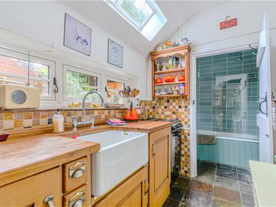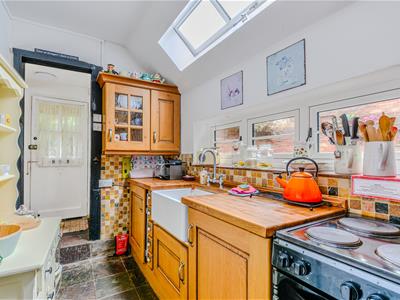 2.67m x 1.68m (8'9 x 5'6)Traditional farmhouse style kitchen, window overlooking garden, base and drawer units with a wall mounted glass display cabinet, fitted shelving, roof line window providing plenty of natural light, part tiled walls, butler sink with mixer tap, space for cooker, Victorian style radiator, Chinese slate flooring.