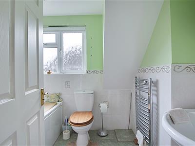 Comprising shower/bath with shower screen, shower controls and showerhead, wc with low level flush, pedestal mounted wash hand basin, half height wall tiling, chrome heated towel rail, obscured glass window to the side elevation.