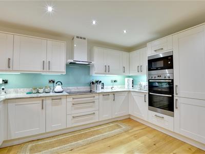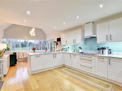 7.35m x 3.75m (24'1" x 12'3")The kitchen area is extensively fitted with a range of modern wall and base mounted units, complementing solid work surface with inset sink, inset induction hob with extractor over, upright unit housing fridge/freezer, further unit housing twin oven and microwave.