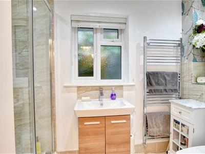 2.66m x 1.21m (8'8" x 3'11")Window to side, large shower cubicle , wash hand basin, low level wc, heated towel rail, tiled floor.