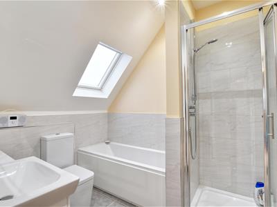 2.63m x 2.13m (8'7" x 6'11")Skylight to the side, a modern white suite comprising panel enclosed bath with mixer tap and shower attachment, separate shower cubicle, contemporary style suspended wash basin, low level wc., heated towel rail.
