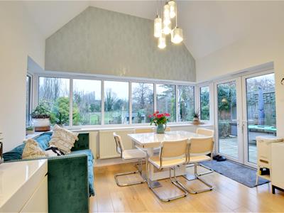 The dining area has a vaulted ceiling, windows to the rear, double doors to the side opening onto the terrace and garden.