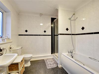 3.38m x 2.46m (11'1 x 8'1)Obscure window to rear, white suite comprising panel enclosed bath with mixer tap and shower spray attachment, pedestal wash hand basin, low level wc, separate large shower cubicle, built in cupboard housing wall mounted boiler.