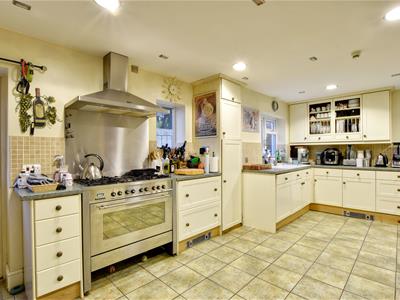 6.78m x 3.86m max (22'3 x 12'8 max)A light and airy double aspect room with window to side, two further windows to rear together with a stable door, extensively fitted with a range of traditional style cupboard and drawer base units, matching wall mounted cabinets and cupboards with shelving and plate rack, complimenting work surface with inset double bowl ceramic sink, further sink bowl with mixer tap, space and point for range style cooker, space for American style fridge/freezer, upright unit housing the oven, integrated dishwasher, built in cupboard, stairs rising to the first floor, tiled floor, door leading through to::
