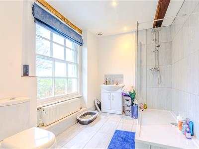 3.05m x 2.13m (10' x 7')Sash window to front aspect, fitted with a low level wc, vanity wash hand basin with mixer tap and storage beneath, large walk in shower with fixed glass screen, hand held attachment and fixed rainfall shower head, tiled floor, part tiled walls, chrome heated towel rail, radiator.