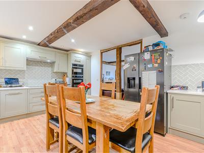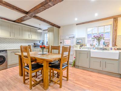 4.17m x 5.26m (13'8 x 17'3)The kitchen is fitted with a comprehensive range of wall and base mounted units with manufactured quarts worksurface, inset double bowl ceramic sink unit with mixer tap, eye level oven with two independent sections and a proving drawer, combination microwave and electric induction hob with AEG extractor fan over, integrated dishwasher, cupboard housing wall mounted boiler, integrated washing machine, space for tumble dryer, space for American style fridge/freezer, exposed ceiling timbers, space for a large family dining table, laminate flooring and original windows to rear aspect and tradition wooden and glazed door with rear access.