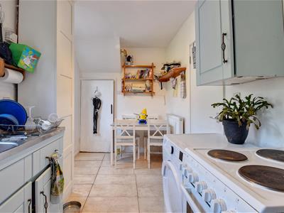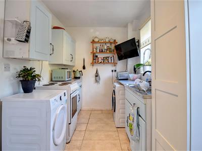 4.45m x 2.01m (14'7 x 6'7)Fitted with a range of light blue cupboard and drawer base units with matching wall mounted cupboards, complementing work surface with inset stainless steel sink/drainer unit and tiled splash-backs, space and point for electric oven, space and plumbing of washing machine, space and point for tumble dryer, upright cupboard housing wall mounted gas fired boiler, tiled flooring, radiator, space for table and chairs, under stairs storage cupboard with space and point for free standing fridge/freezer, window to the rear elevations and part glazed door allowing access through to the garden.