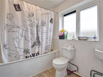 Fitted with a white suite comprising low level W.C, corner wash-hand basin, panelled bath, radiator and obscured glazed window to the rear elevation.