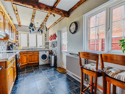 The kitchen is fitted with matching wall and base mounted units with a complimenting work surface, one and a half bowl sink unit with side drainer and mixer tap, space for oven with cooker hood over, integrated fridge, space and plumbing for washing machine, Rayburn, exposed ceiling timbers, built in breakfast bar area and radiator.