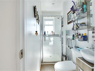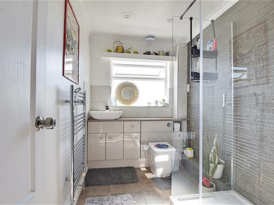 Suite comprising w.c. with low level flush, wash hand basin with vanity drawers beneath, chrome heated towel rail, walk-in shower cubicle with controls, chrome controls and shower head, obscure glass windows to the rear southerly elevation, tiled floor.