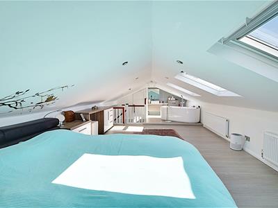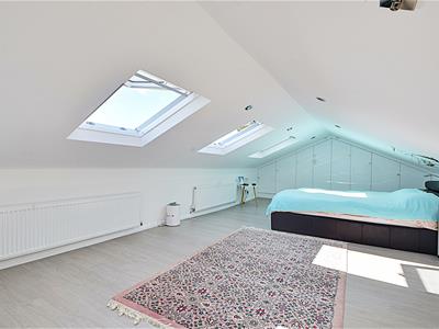 From the first floor with built-in storage wardrobe cupboards with drawers and window overlooks the front elevation, double radiator, stairs leading to suite with velux windows to the rear with far reaching views.
