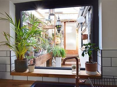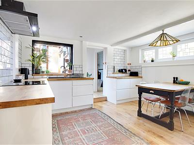 3.99 x 3.34 (13'1" x 10'11")Modern fitted kitchen with a range of matching wall and base level units with wood straight edge worktop surfaces, integrated electric oven, four ring electric hob with extractor canopy above, single drainer sink unit with mixer tap, integrated fridge and freezer, double radiator, tiled splashbacks, window to the rear elevation, stained glass window to the side elevation.