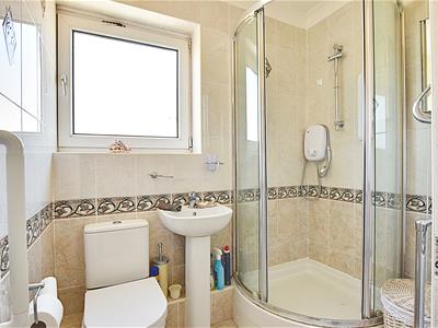 Modern suite comprising w.c. with low level flush, pedestal mounted wash hand basin with mixer tap, walk-in shower cubicle with wall mounted shower controls, chrome shower attachment and chrome shower head, tiled walls and tiled flooring, obscure double glazed windows to the rear elevation.