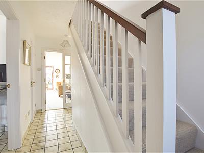 With stairs leading to first floor, radiator, tiled flooring, storage cupboard, internal door leading through to garage.