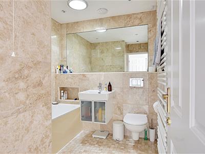 Modern suite comprising wc with low level flush, vanity unit with wash hand basin with mixer tap, panelled bath with chrome controls, chrome shower attachment and showerhead, tiled walls, tiled floor, heated towel rail.