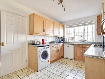 Modern fitted kitchen with a range of matching wall and base level units with straight edge granite worktop surfaces, one and half bowl sink with drainer and mixer tap, integrated electric oven, four ring gas hob with extractor canopy above, space and plumbing for washing machine and dishwasher, space for freestanding American style fridge and freezer, breakfast bar, radiator, windows to the front elevation overlooking the front garden.