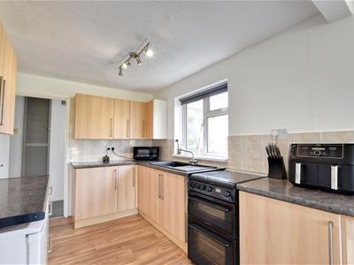 2.44m x 3.10m (8' x 10'2)Fitted with a range of cupboard and drawer base units with matching wall mounted cabinets, complimenting work surface, inset sink, space and point for cooker, space and point for fridge, window to side elevation, open plan to: