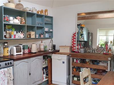 4.65m x 3.74m (15'3" x 12'3")Skylight, double bifold doors onto garden, wall and base mounted units, space for cooker, space for dishwasher, space for fridge freezer, characterful beams.