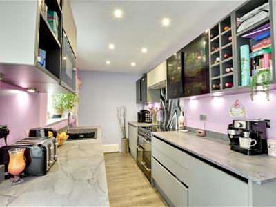 5.51m x 3.05m (18'1 x 10')Extensively fitted with a range of modern cupboard and drawer base units with matching matching wall mounted cupboards and glazed cabinets, space for range, complimenting work surface with inset sink.