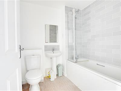 Suite comprising panel enclosed bath, hand held shower attachment, shower screen, low level wc, pedestal wash hand basin, tiled splashback, electric shaver point, heated chrome towel rail.