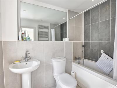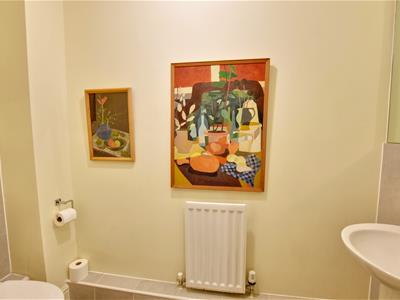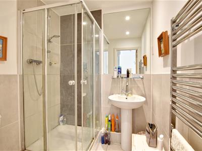 1.78m x 1.70m (5'10 x 5'7)Shower Cubicle, pedestal wash hand basin and WC, heated towel rail, tiled floor, part tiled walls.