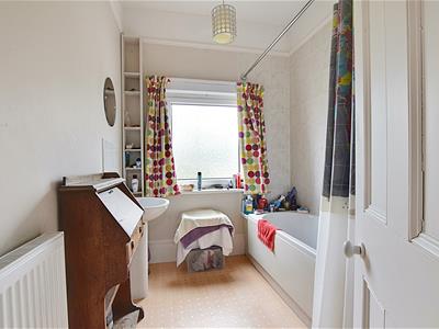Obscure double glazed window to the front elevation, suite comprising panel enclosed bath with mixer tap with additional chrome wall mounted shower attachment and shower head, pedestal wash hand basin, radiator.