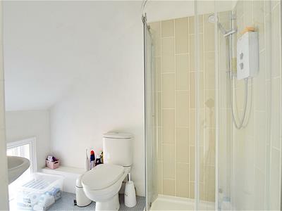 Suite comprising low level wc, floating wash hand basin with mixer tap, walk in shower cubicle with wall mounted shower controls, chrome shower attachment and chrome shower head, radiator, obscure glazed window to the front elevation.