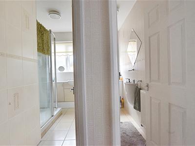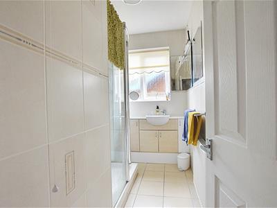 Suite comprising walk-in shower with electric shower unit and shower head, sliding door, inset wash hand basin with vanity unit beneath, obscure glass window to the side elevation, tiled walls, tiled floor and double radiator.