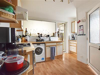 3.71m x 3.68m (12'2 x 12'1)Obscure glass window overlooks the side elevation. Fitted kitchen comprising a range of base and wall units with laminate worktops, single drainer stainless steel sink unit with mixer tap, tiled splashbacks, plumbing for washing machine, integrated oven and grill with gas hob, extractor canopy and light, space for additional white goods, double radiator. Door to the side lobby and recess for a fridge/freezer.