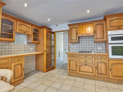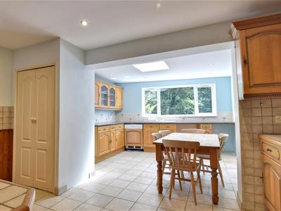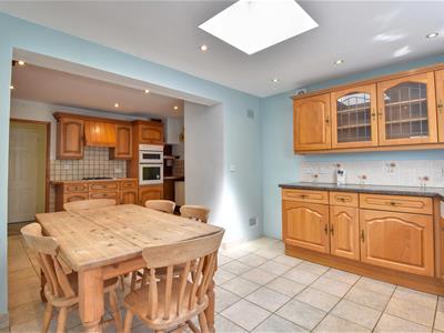 7.62m x 4.34m (25' x 14'3 )Extensively fitted with a range of traditional style cupboard and drawer base units with matching wall mounted cupboards, generous tiled work surface with matching splashback, inset one and a half bowl ceramic sink drainer unit, inset four burner gas hob with extractor canopy above, upright unit housing integrated double oven, integrated dishwasher, space and plumbing for washing machine, space and point for free standing fridge/freezer, fitted pantry cupboard with with folding door, window to the rear elevation enjoying a pleasant view over the garden, tiled flooring, radiator, space for table and chairs and obscure glazed door to the side elevation providing access through to the garage/garden.