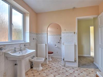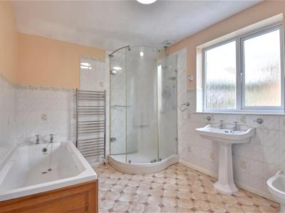 Fitted with a white suite comprising low level wc, pedestal wash hand basin, bidet, wood panelled bath, large corner shower cubicle, part tiled walls, stainless steel heated towel rail, fitted storage cupboards, two obscure glazed windows to the side elevation.