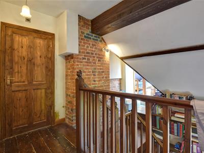 Galleried landing with stairs rising from the reception hallway, Velux style window to the front elevation, exposed floorboards, exposed brick chimney breast and doors to: