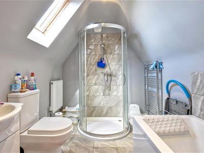 Fitted with a modern white suite comprising low level W.C, white gloss vanity unit with inset wash-hand basin and fitted cupboard beneath, panelled bath with hand held shower attachment, shower cubicle with sliding doors, stainless steel heated towel rail, tiled flooring, radiator and Velux style window to the side elevation.