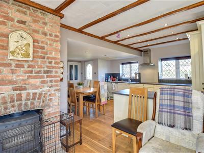7.34m max x 6.43m (24'1 max x 21'1)This impressive open-plan space benefits from being triple aspect with an attractive bay window to the side and further windows to the front and rear elevations, exposed brick feature fireplace with inset wood burning stove, exposed beams, recessed ceiling spot lights, wooden flooring and two radiators.