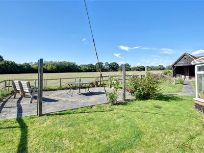 To the front double gates opens to a generous gravelled driveway providing off road parking/turning space for several vehicles and access to the detached garage/workshop. The gardens are predominantly laid to lawn being interspersed with a selection of trees, shrubs and roses with a generous paved patio area offers a delightful spot for outside dining/entertaining and enjoying the impressive countryside views.