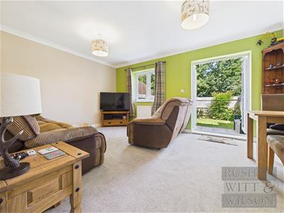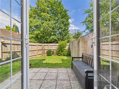 The property offers bright and neutrally decorated accommodation comprising a well-equipped kitchen, spacious sitting/dining room with doors opening onto the garden, a downstairs cloakroom, two double bedrooms, and a stylish bathroom with both bath and separate shower.