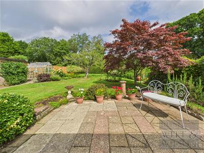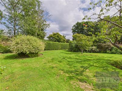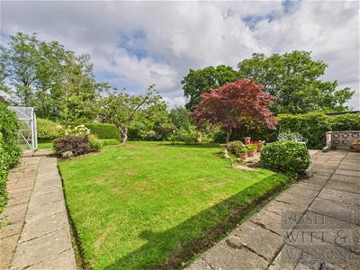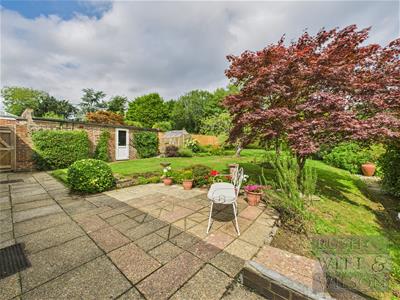 The property is set well back behind a charming lawn, with a long private driveway leading to a detached garage, creating an immediate sense of space and seclusion. Sitting on a superb plot of around one-fifth of an acre, the outside space is a real highlight. The rear garden is both generous and level, beautifully stocked with colourful plants, mature trees, and shrubs, while a sunny paved patio offers the perfect spot for relaxing or entertaining. A greenhouse and garden shed complete the picture for keen gardeners.