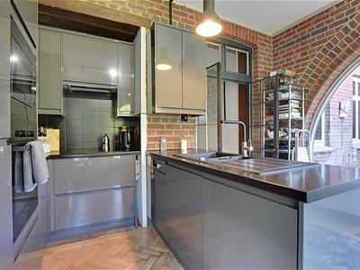 5.11m x 4.29m (16'9 x 14'1)Dual aspect with double glazed windows to side elevations with additional beautiful featured arch double glazed panelled windows to side and rear elevation, door leading onto patio and garden, modern fitted kitchen with a matching wall and base level units, laminate straight edge worktop surfaces, one and a half bowl sink with side drainer and mixer tap, integral electric oven, integral microwave, four ring electric hob and extractor canopy above, integral fridge/freezer, hanging ceiling lights, herringbone flooring, electric radiator.