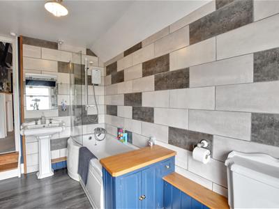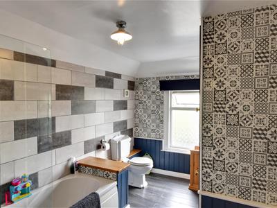 1.71m x 0.7m (5'7" x 2'3" )White suite comprising wash basin, wc, tiled floor, panelled and tiled walls, window to the rear.